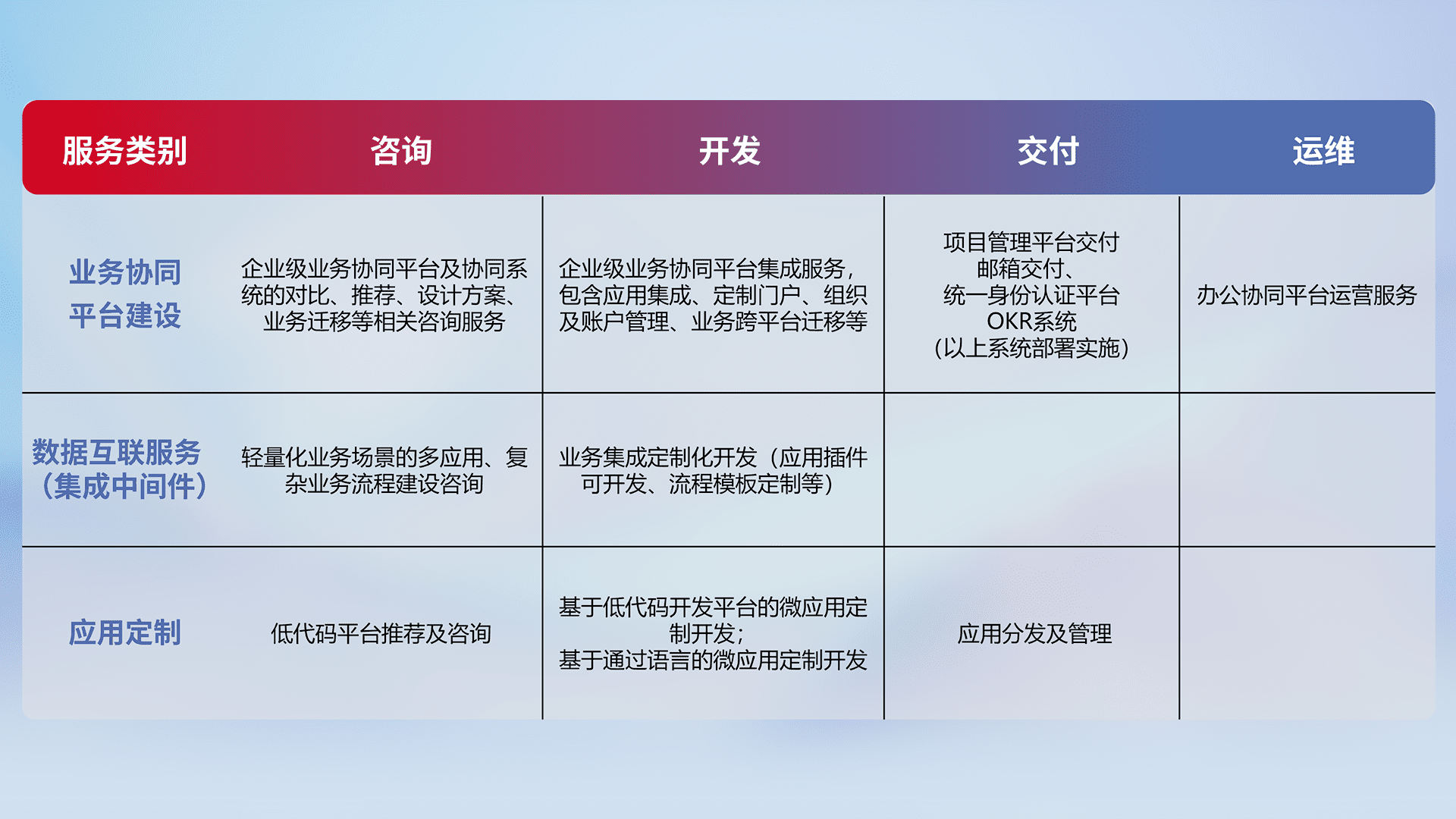 针对钉钉、、、企微、、IDaas等平台级产品提供产品的规划、、方案、、交付、、、定制化开发等服务,,,,实现如统一协同办公、、、智能客户服务、、、混合会议管理、、智能数据查询、、等业务场景,,,实现数字化转型。。。。